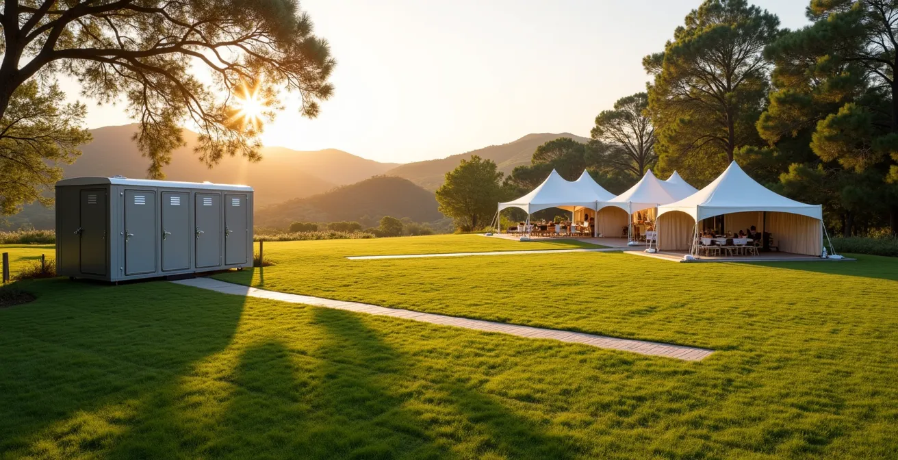 The first and most immediate reality check for any aspiring backyard wedding is sanitation. Your home’s two or three bathrooms are not equipped to handle 100+ guests in formal wear over a 6-hour period. The solution isn’t a row of plastic porta-potties, which are entirely inappropriate for a high-end event. The mandatory standard is an “executive” restroom trailer. These units feature flushing toilets, running water sinks, climate control, and lighting, mirroring the experience of a permanent facility. However, they are a significant logistical and financial undertaking.